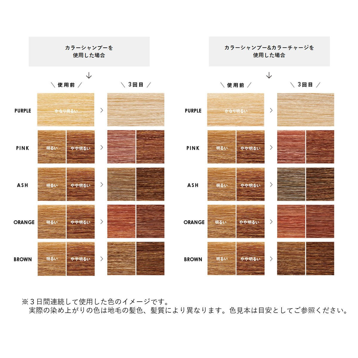 また、「カラーシャンプーやカラートリートメントを使った直後にサロンカラーをすると、色素の影響で思い通りの色になりにくい……」という心配が少なく、サロンカラー※の直前まで使用していただけます。