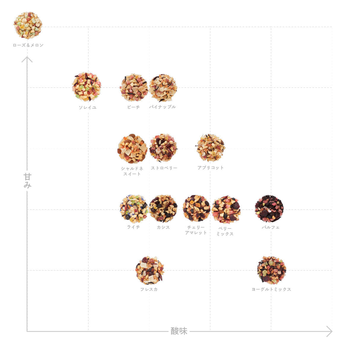 有機ドライアップル(オーストリア製造)、加糖ドライパイナップル、加糖ドライマンゴー、加糖ドライキウイフルーツ、加糖ドライブルーベリー、有機ハイビスカス、コーンフラワー/香料、クエン酸、保存料(亜硫酸塩)、着色料(黄4、青1)